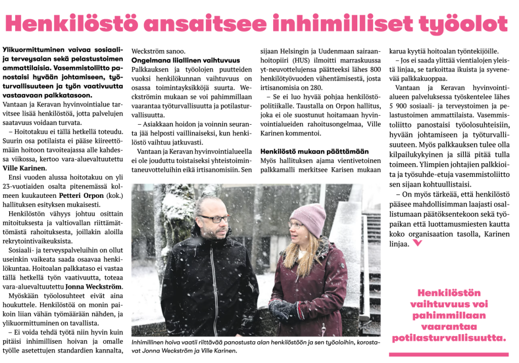 Säästöt eivät ole vain lukuja budjetissa, ne osuvat suoraan ihmisiin. Työntekijöiden arjessa läsnä ovat toistuvat yt-neuvottelut, tehtävämuutokset ja epävarmuus omasta työstä vähentäen luottamusta tulevaisuuteen. Moni kokee, ettei omaa osaamista enää arvosteta – vaikka juuri heidän työnsä pitää palvelut pystyssä. Kun työn merkitys murenee, heikkee myös ammatillinen ylpeys, motivaatio ja hyvinvointi.